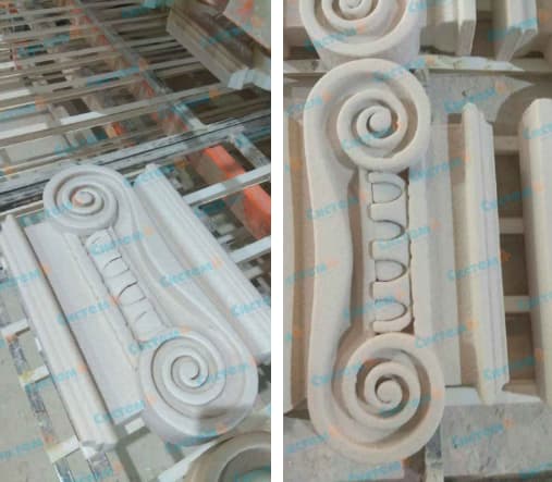 Капители из пенопласта наиболее часто изготавливаются методом фрезерной обработки, так как имеют сложную конфигурацию. Их мы изготовили по чертежу клиенту, затем укрепили эластичным кварцевым покрытием.