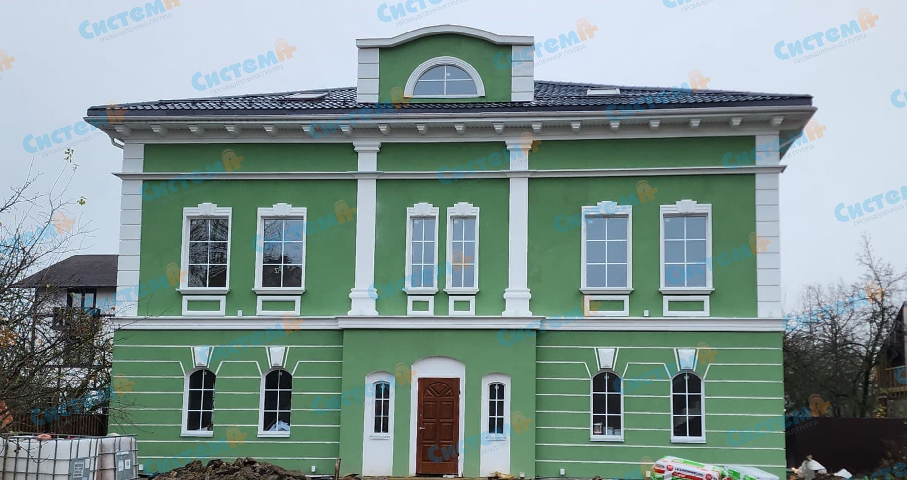 Для того, чтобы подчеркнуть классический стиль, в котором оформлен особняк, в качестве элементов декора выбрали карнизы, кронштейны, наличники, русты, замковые камни и подоконники.